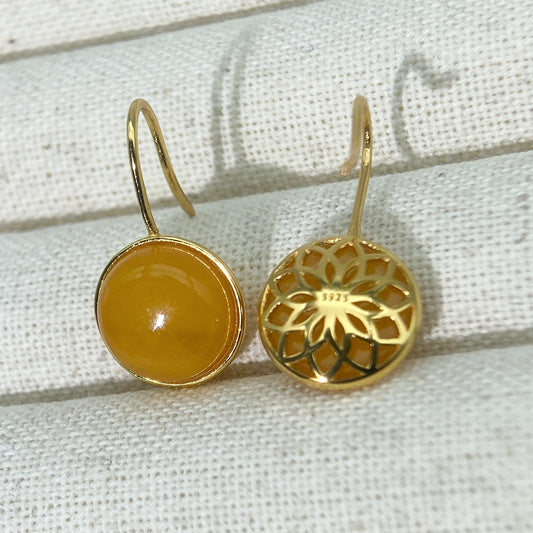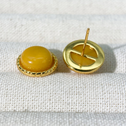 Natural Yellow Amber Earrings - Classic Round Vintage Gemstone Studs
