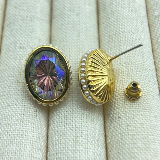 Vintage Oval Stud Earrings Glass Shell Pearl 18k Gold Plated